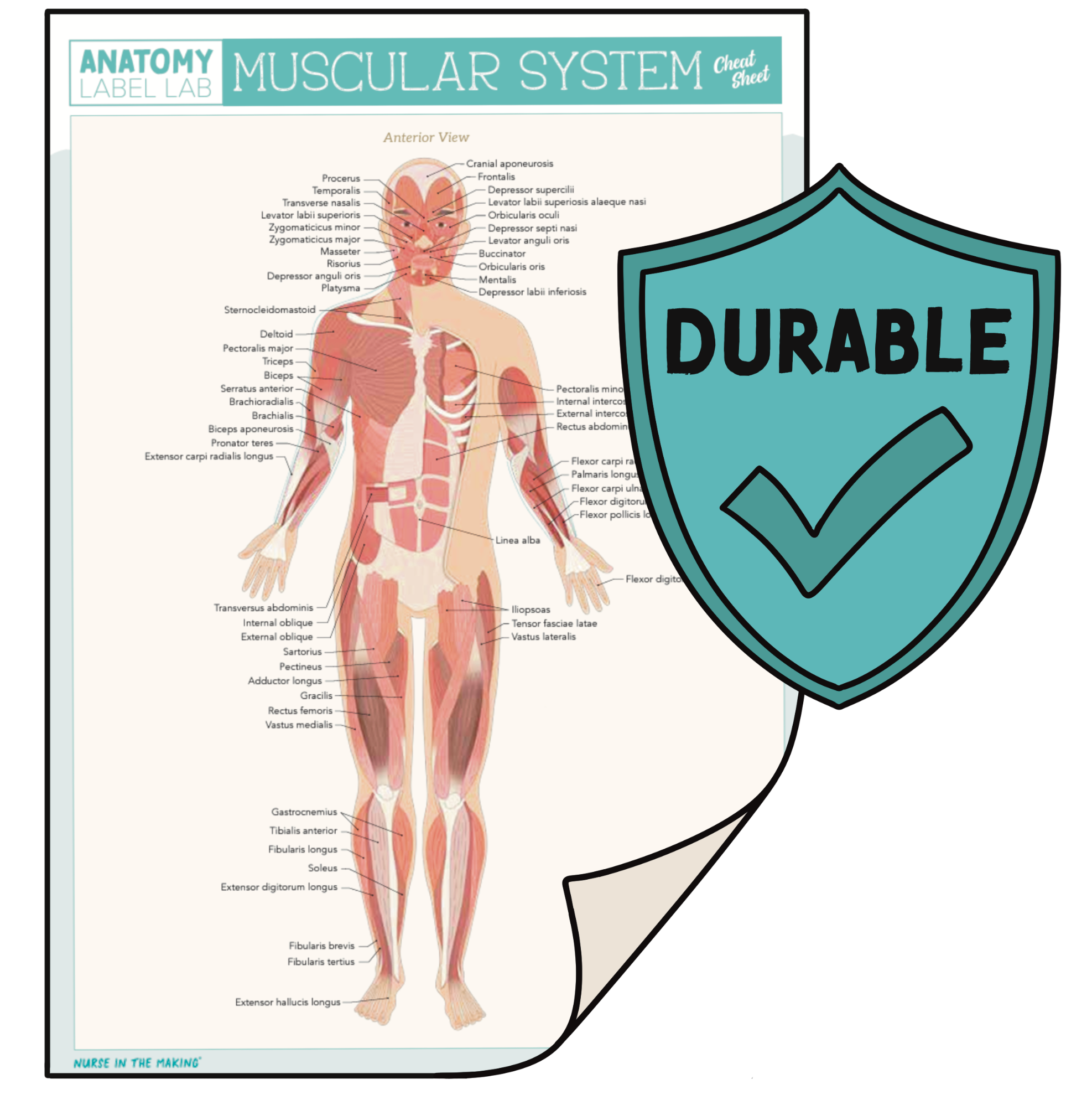 The Anatomy Label Lab Cheat Sheets are laminated 2-page references designed to help students quickly identify and review key muscular and skeletal structures. Perfect for pre-med, pre-nursing, biology, or allied health students taking anatomy and physiology, it features clearly labeled diagrams of the muscular system (anterior, lateral, and posterior views) and skeletal system (skull, spine, hand, and foot). Whether you're studying for A&P exams or reinforcing your anatomy knowledge, these cheat sheets are simple, effective tools to support your success.